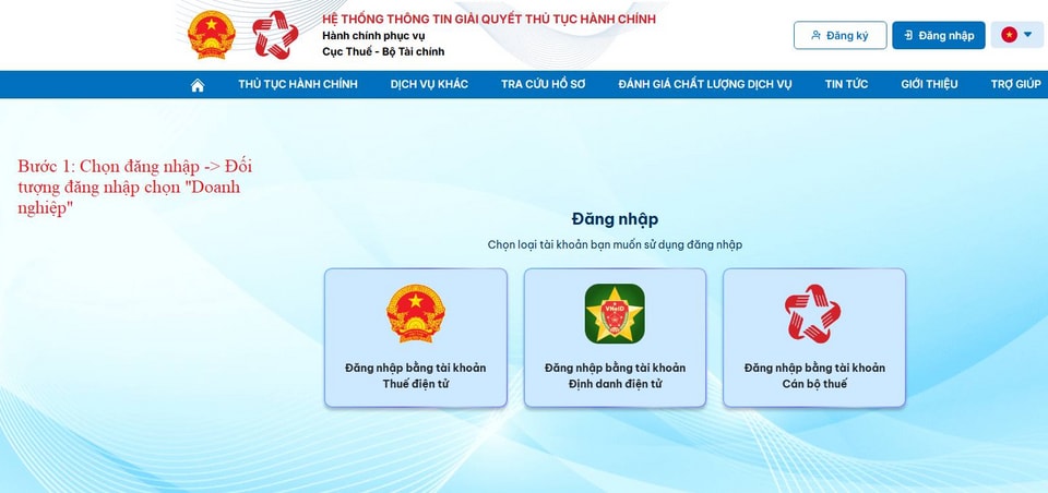 Bước 1: Truy cập và đăng nhập vào trang dịch vụ công của Tổng cục Thuế. Tại mục đối tượng đăng nhập, bạn chọn "Doanh nghiệp".