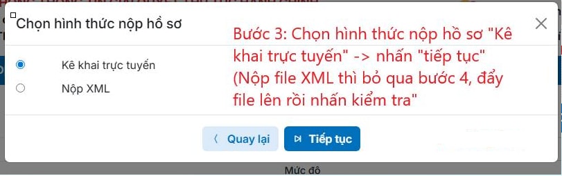 Bước 3: Tại mục hình thức nộp hồ sơ, chọn "Kê khai trực tuyến" và nhấn "Tiếp tục". Lưu ý, nếu bạn đã có file XML thì có thể chọn đẩy file lên và kiểm tra ngay.