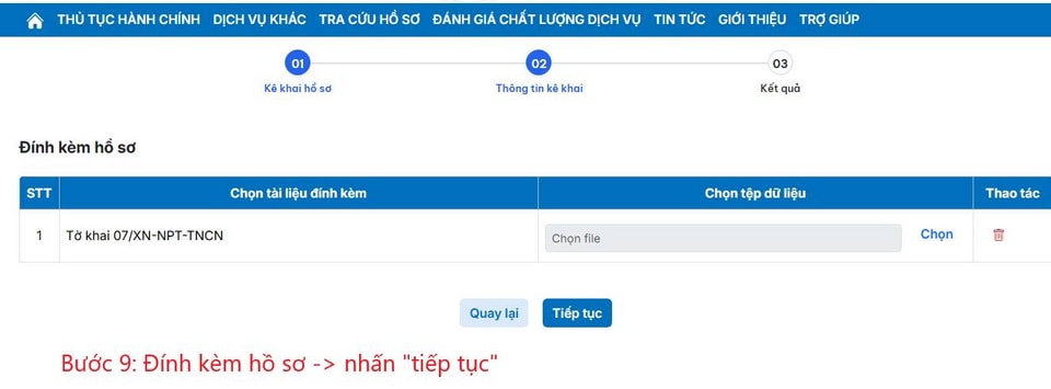 Bước 9: Thực hiện đính kèm các hồ sơ liên quan theo yêu cầu và nhấn "Tiếp tục".