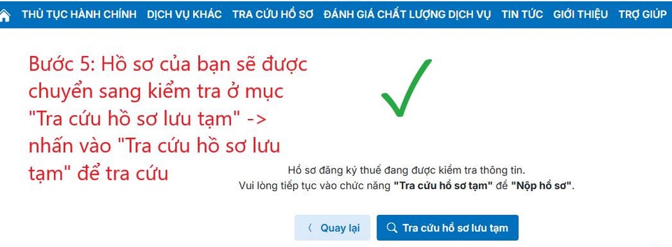Bước 5: Hệ thống sẽ chuyển hồ sơ sang mục "Tra cứu hồ sơ lưu tạm". Bạn nhấn vào đây để tiếp tục quá trình.