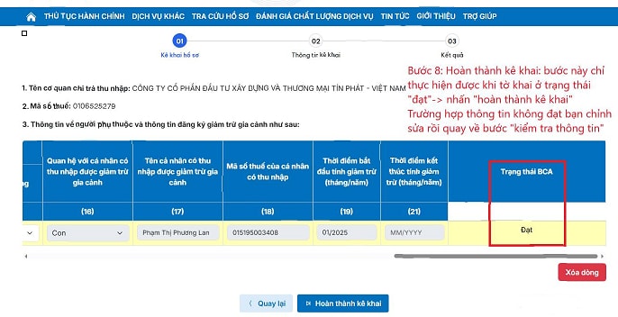 Bước 8: Chỉ khi hồ sơ ở trạng thái "Đạt", bạn mới có thể nhấn "Hoàn thành kê khai". Nếu không đạt, cần chỉnh sửa lại thông tin.
