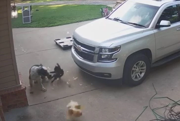 Theo nội dung được ghi lại, khi phát hiện con chó đang ngoạm chặt con gà, chú mèo lập tức chạy tới can thiệp. Ban đầu, nó thận trọng tiến lại gần, quan sát đối thủ, dường như đang tìm thời cơ để ra tay. Chỉ vài giây sau, con mèo vung móng tát thẳng vào người chó khiến kẻ săn mồi bất ngờ buông con gà ra.