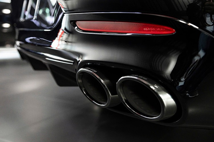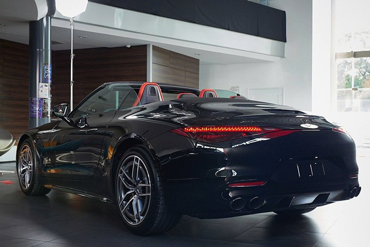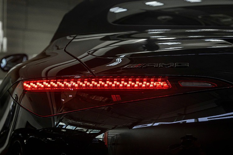 Vòng ra đuôi xe, Mercedes-AMG SL43 thế hệ mới nhất đang bán tại Việt Nam có đèn hậu LED mới, phần khoang hành lý chia làm đôi, để làm chỗ trống cất mui xe. Cuối cùng là việc xe được trang bị ống xả kép đối xứng, dạng tròn.
