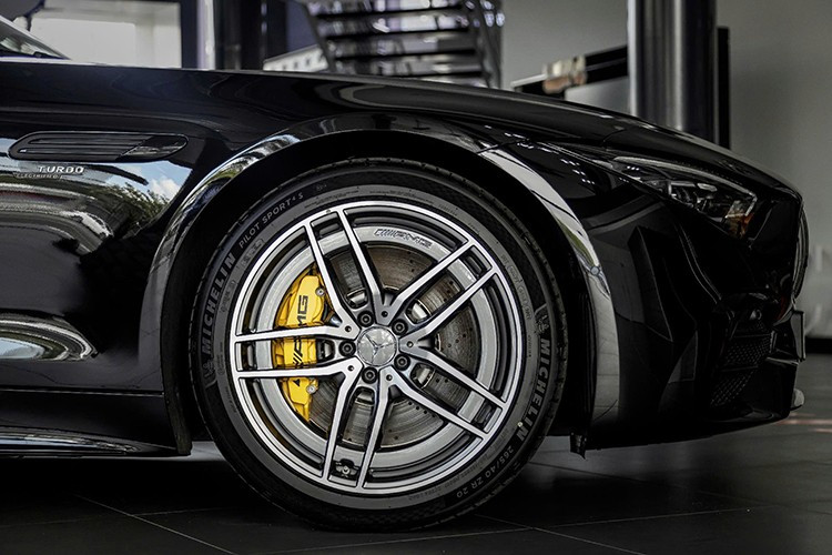 Cụm đèn pha LED mới có hình tam giác, phần hốc gió trước được nối liền, tiếp đến là hốc gió bên tích hợp thêm 2 thanh chia gió nhỏ. Dòng xe thể thao Mercedes-AMG SL43 còn sẽ được trang bị la-zăng mới, đa chấu kép, thể thao, như xe trong bài, chi tiết này màu bạc cùng kẹp phanh màu vàng.