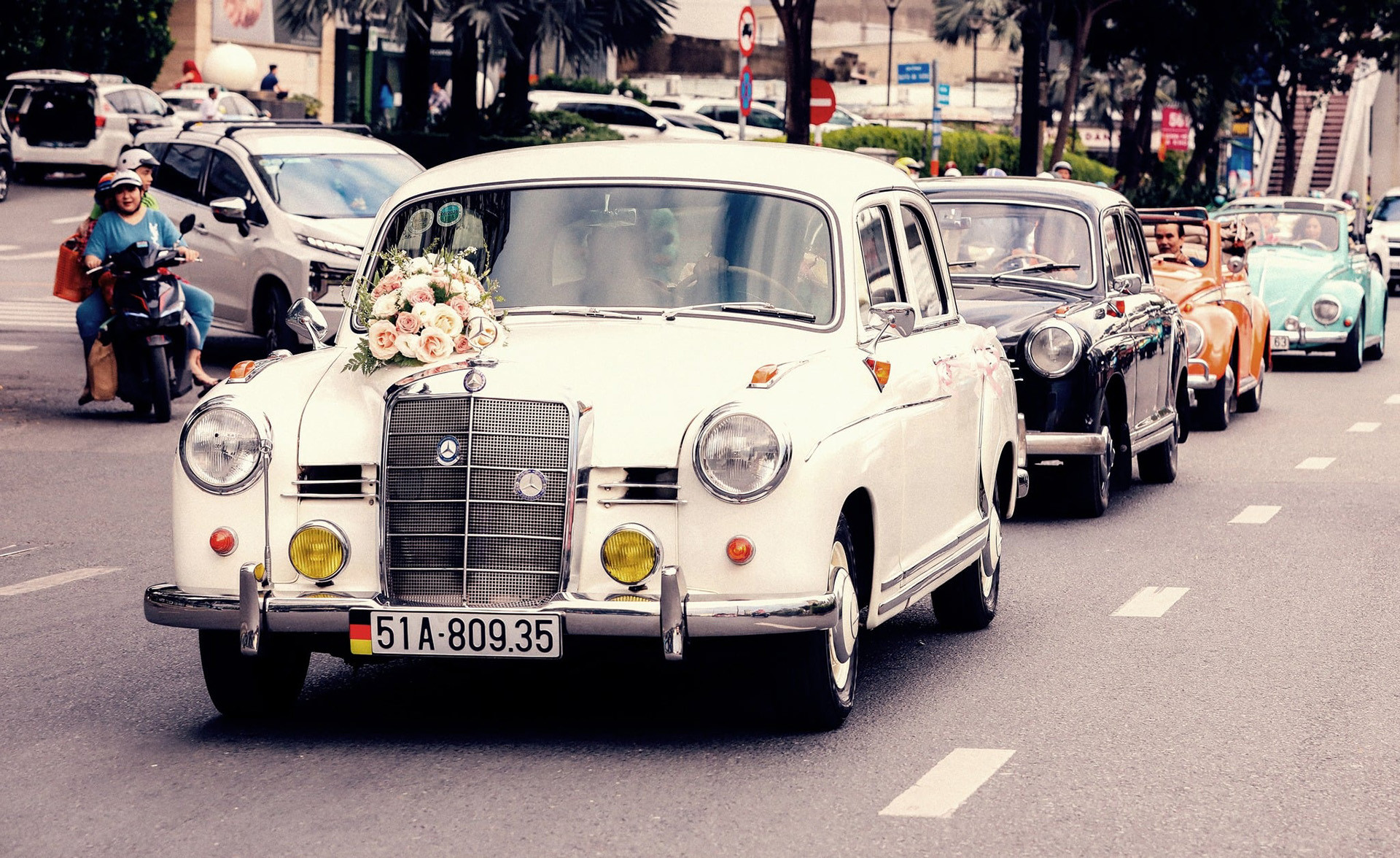 Chiếc Mercedes-Benz Ponton 190 màu trắng của nhà sưu tầm Tùng Trần được sử dụng làm xe đón dâu trong sự kiện đám hỉ của thành viên CLB Xe cổ Sài Gòn