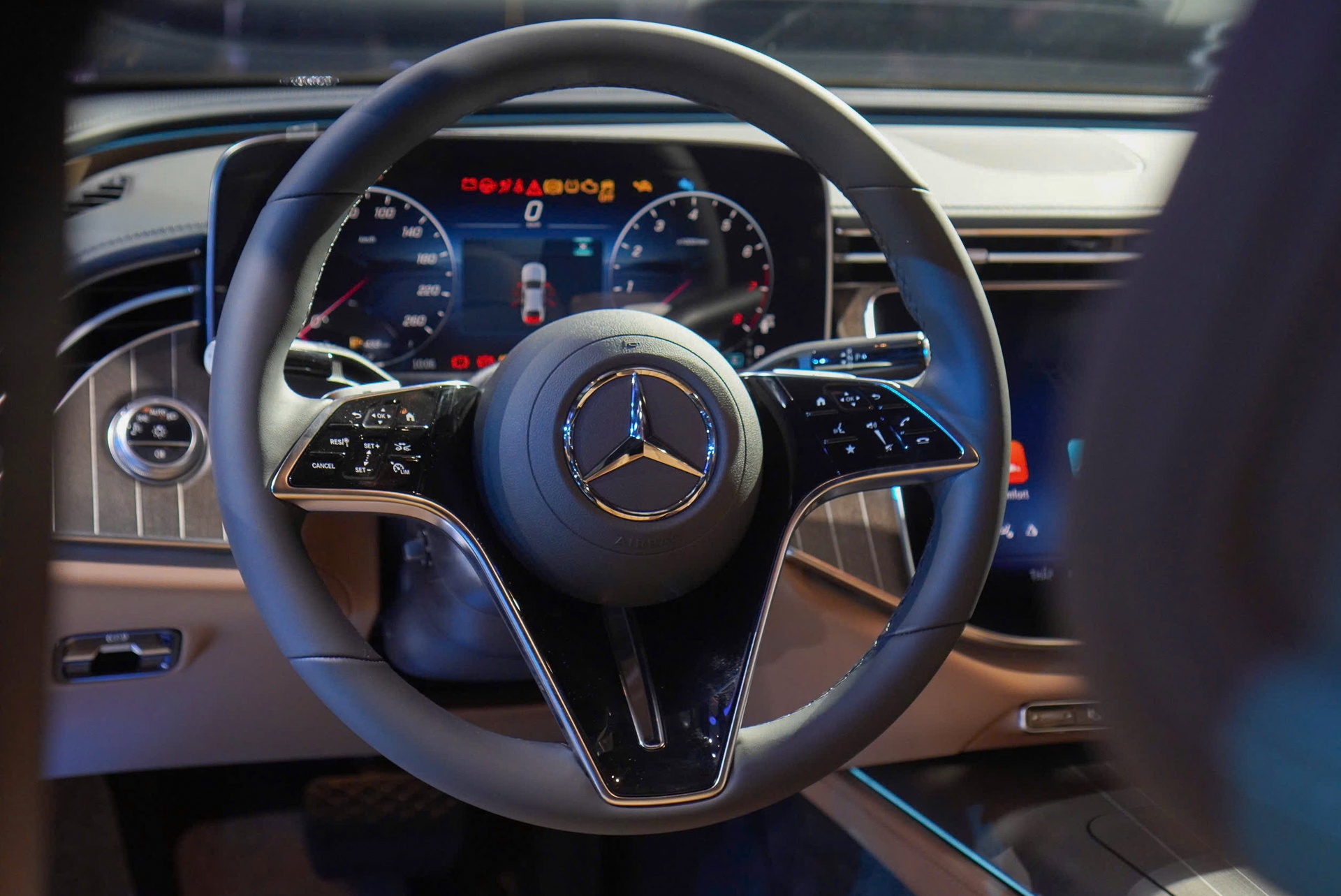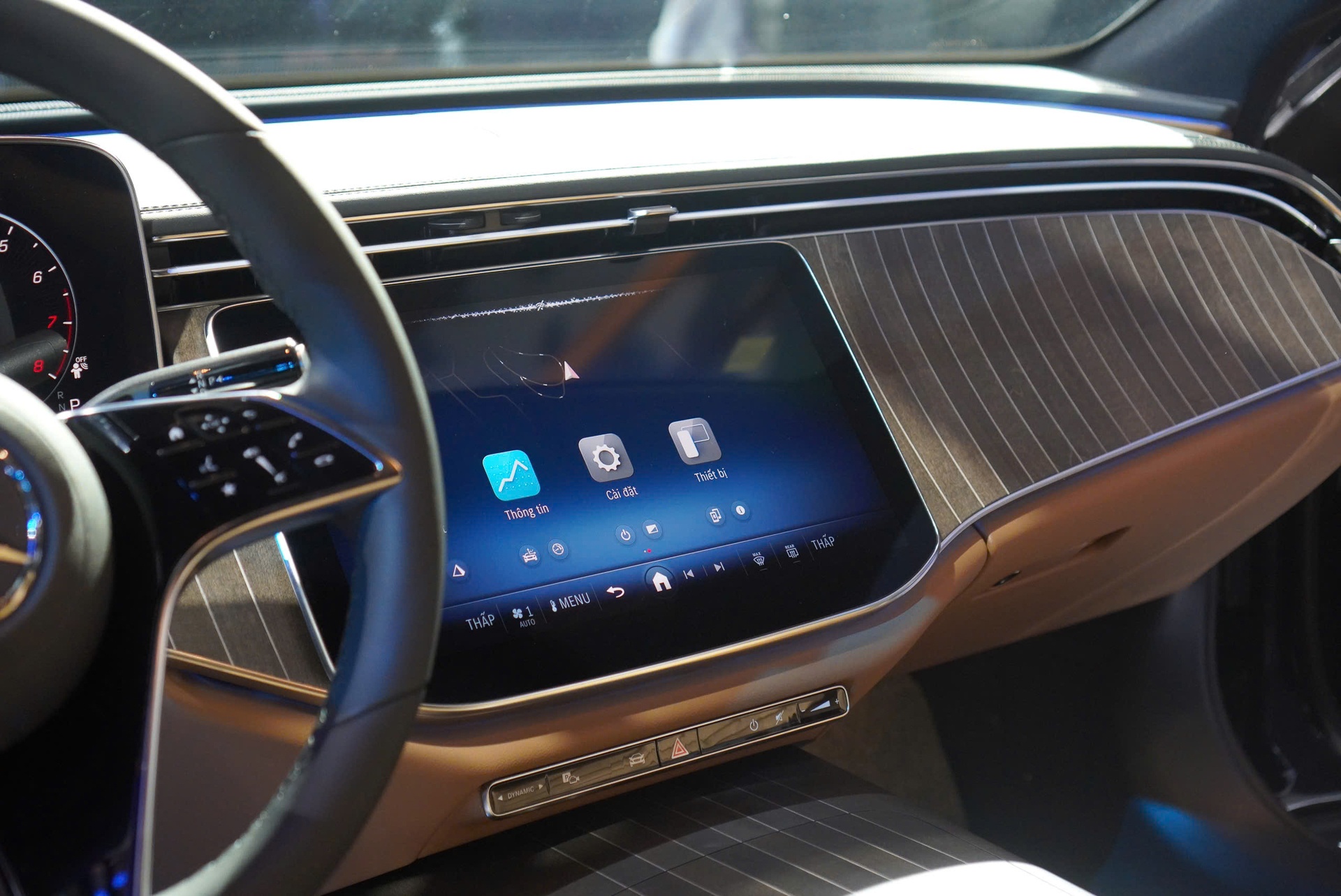 Tại trung tâm táp-lô là màn hình cảm ứng trung tâm công nghệ LCD kích thước 14,4 inch, tích hợp hệ thống giải trí MBUX, kết nối Apple CarPlay và Android Auto không dây. Khoang cabin của xe còn có hệ thống âm thanh vòm Burmester 4D với 17 loa, 4 bộ cộng hưởng, công suất tối đa 710 W đi kèm công nghệ Dolby Atmos.