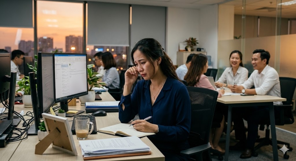 Có lẽ, sai lầm của tôi không phải là đã yêu anh, mà là đã để tình yêu ấy bám rễ quá sâu vào nơi mà lẽ ra chỉ nên dành cho công việc. Để rồi giờ đây, mỗi ngày đi làm với tôi đều là một cuộc đấu tranh giữa lý trí và con tim, giữa việc muốn nghỉ việc để trốn chạy và việc phải ở lại vì gánh nặng cơm áo gạo tiền.