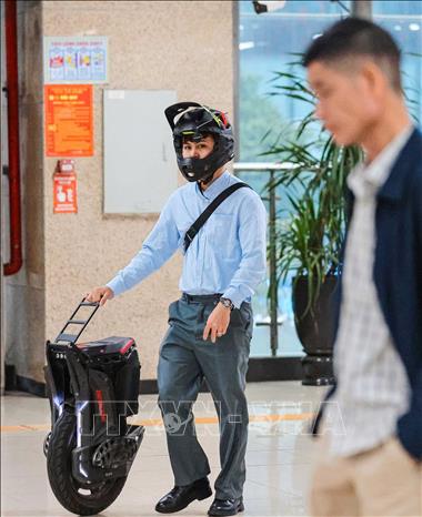 Một hành khách khi đi tàu điện trên cao còn chủ động kết hợp mang theo xe điện gấp gọn, nhằm linh hoạt cho quãng đường di chuyển tiếp theo, tối ưu hóa hành trình đi lại theo hướng thuận tiện và thân thiện với môi trường. Ảnh: Hoàng Hiếu/TTXVN