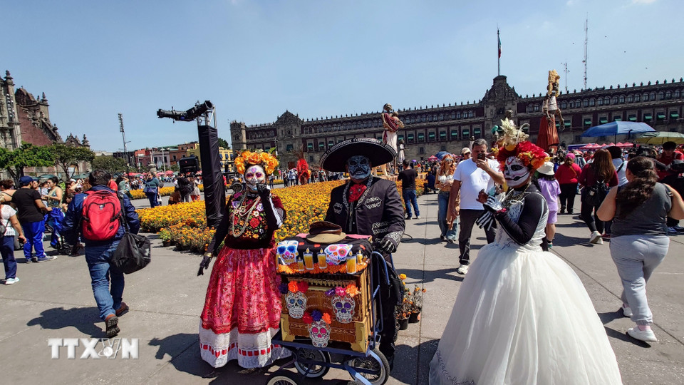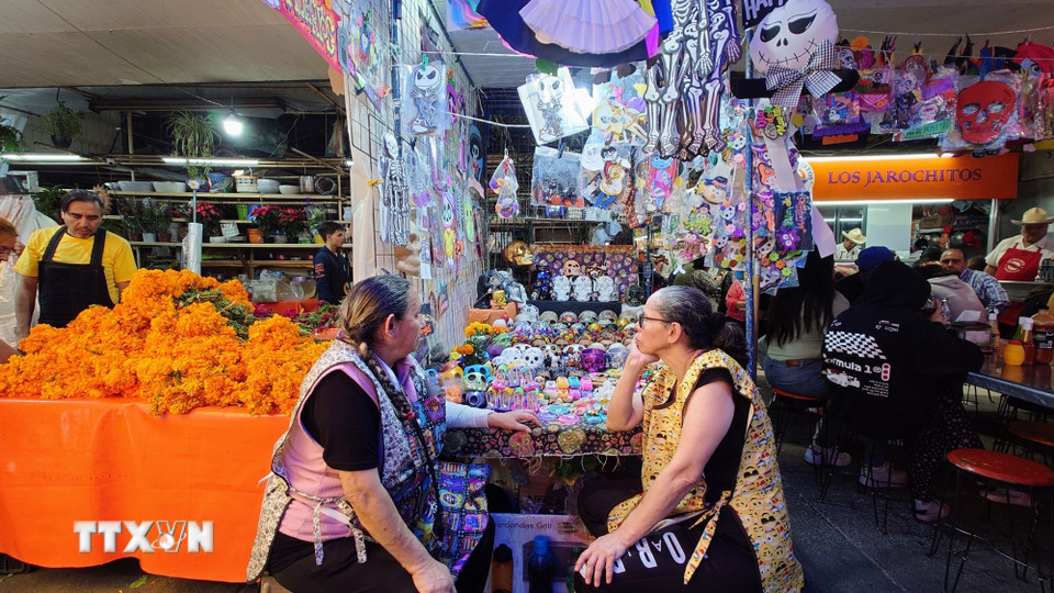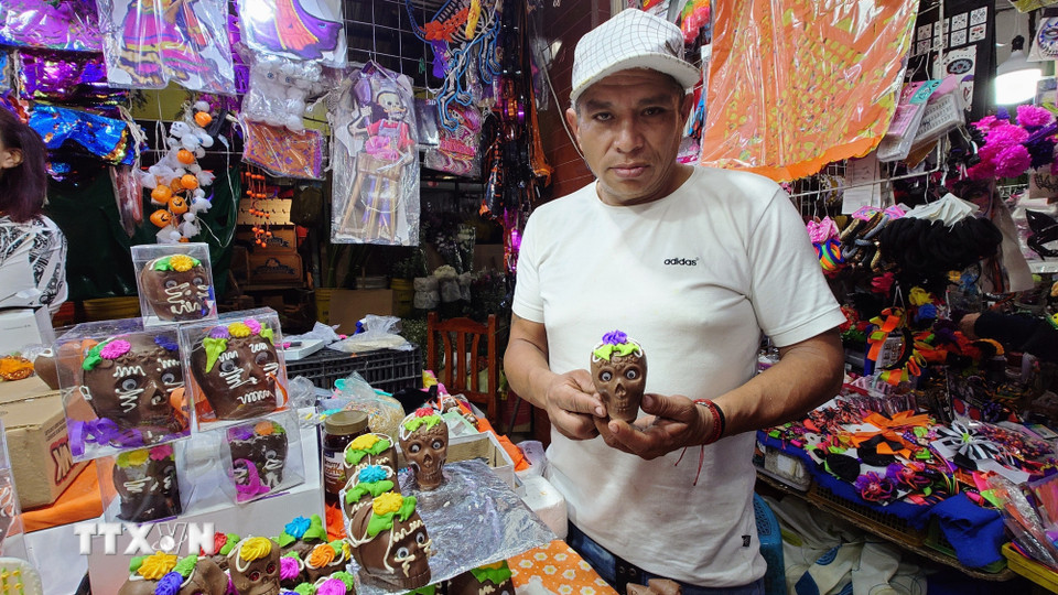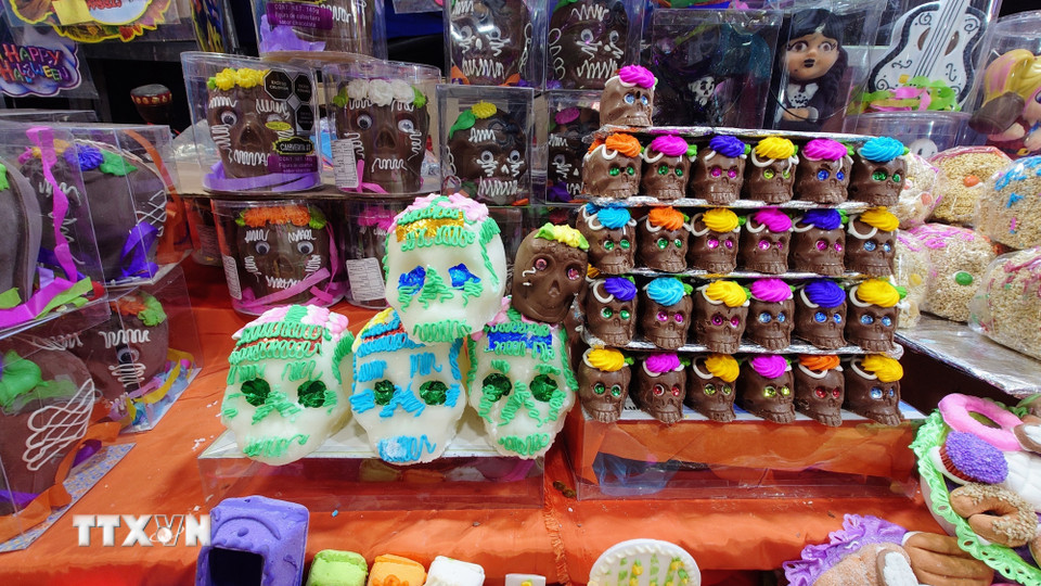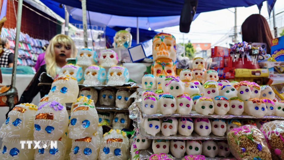 Giữa dòng người rộn ràng, những chiếc calaveritas (đầu lâu bọc đường) nằm dưới nắng chiều, lấp lánh như ký ức ngưng đọng, song vẫn tươi vui và rực rỡ như mang theo lời mời dịu dàng gửi đến những linh hồn ở bên kia thế giới “Linh hồn ơi hãy trở về, chúng tôi vẫn đang chờ”. (Ảnh: Phi Hùng/TTXVN)
