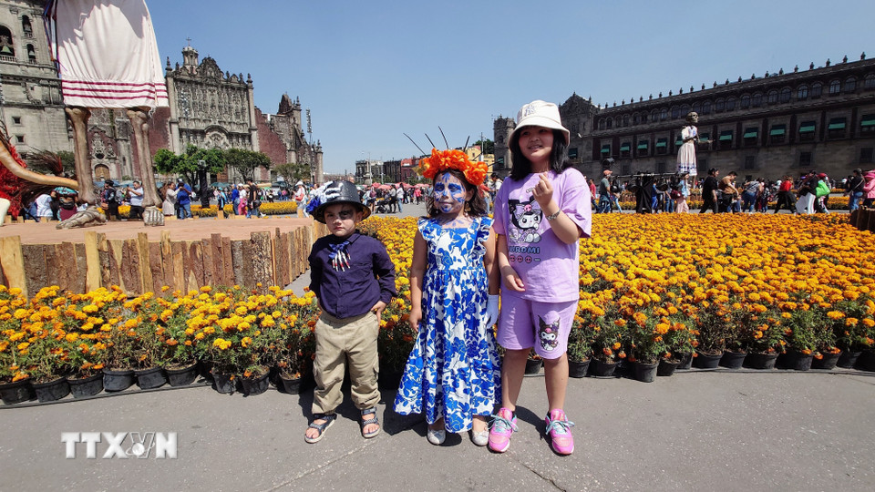 Các em nhỏ tạo dáng bên cúc vạn thọ trong Lễ hội của người chết tại Quảng trường lịch sử Zocalo, thủ đô Mexico City, Mexico. (Ảnh: Phi Hùng/TTXVN)