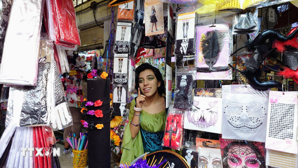Một gian hàng bán phụ kiện trang điểm cho Lễ hội Người chết (Día de los Muertos) tại trung tâm thủ đô Mexico City, Mexico. (Ảnh: Phi Hùng/TTXVN)