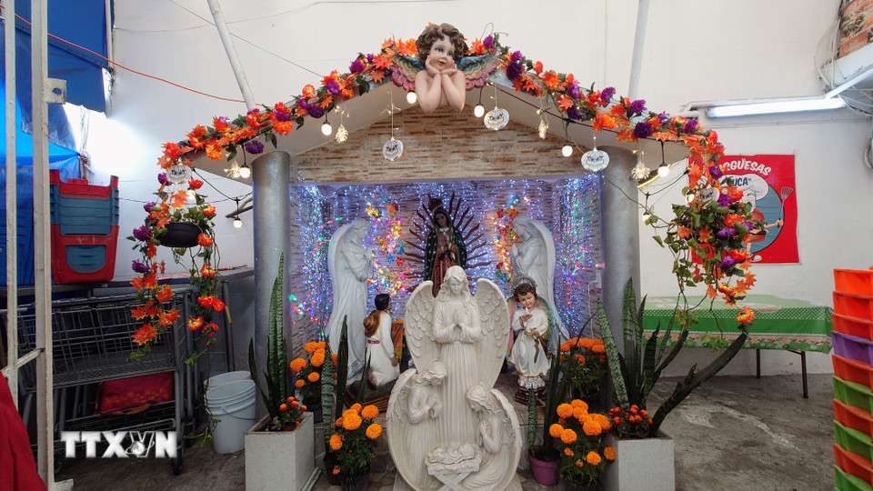 Một ban thờ theo phong cách Thiên chúa giáo tại trung tâm chợ Dulces de Ampudia, thủ đô Mexico City, Mexico. (Ảnh: Phi Hùng/TTXVN)