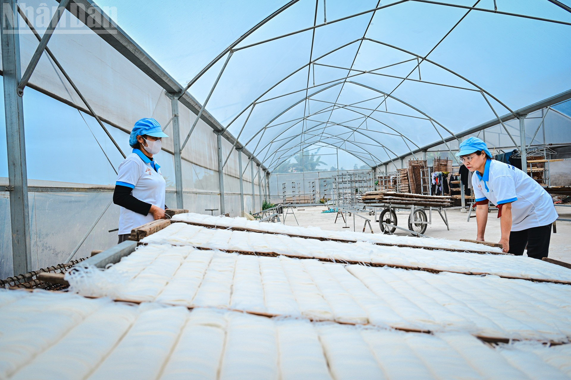 Người thợ làm mì Chũ tại Hợp tác xã Trại Lâm, xã Nam Dương, tỉnh Bắc Ninh phơi sản phẩm trong nhà màng.