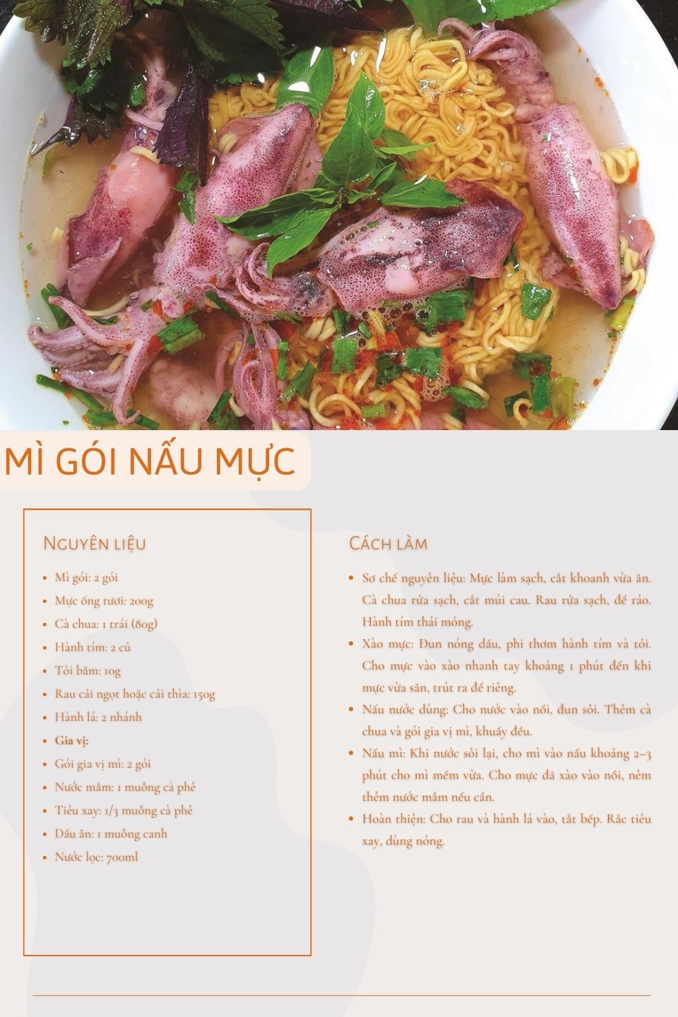 Khi hoàn thiện, tô mì gói nấu mực bốc khói, sợi mì vàng óng, mực trắng giòn xen lẫn rau xanh, nước dùng trong và thơm. Món ăn này thường dùng nóng, có thể ăn kèm ớt cắt lát, tiêu xay hoặc chanh để tăng hương vị. Dù là món ăn đơn giản, mì gói nấu mực vẫn mang lại cảm giác đủ đầy, phù hợp cho những bữa ăn nhanh nhưng vẫn có chút hải sản tươi.