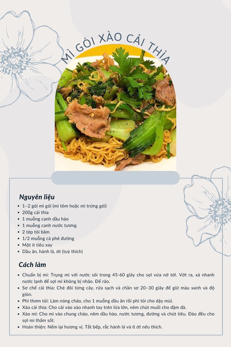 Điểm cộng của món mì gói xào cải thìa là khả năng biến tấu linh hoạt tùy theo những gì đang có trong gian bếp. Chỉ cần thêm vài lát thịt bò, trứng, tôm, xúc xích hoặc nấm, món ăn trở nên phong phú hơn. Nhưng ngay cả phiên bản đơn giản chỉ có mì và cải thìa vẫn đủ hấp dẫn bởi độ giòn của rau, độ dai của mì và hương thơm nhẹ từ tỏi phi.