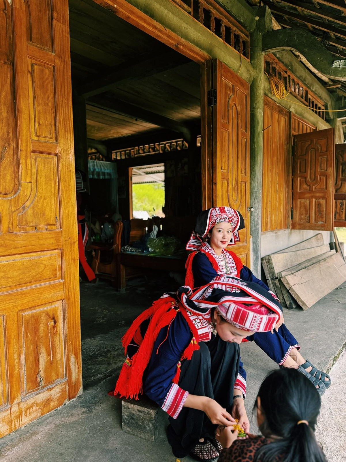 Trang phục truyền thống này thường được thêu tay tỉ mỉ với các họa tiết hoa văn phức tạp, mang ý nghĩa cầu mong hạnh phúc, may mắn. Chiếc khăn đội đầu đỏ nổi bật, những dải tua rua, hay các chi tiết thêu cầu kỳ trên áo và yếm đã góp phần tôn lên vẻ đẹp dịu dàng, nhưng cũng đầy sức sống của cựu hot girl.