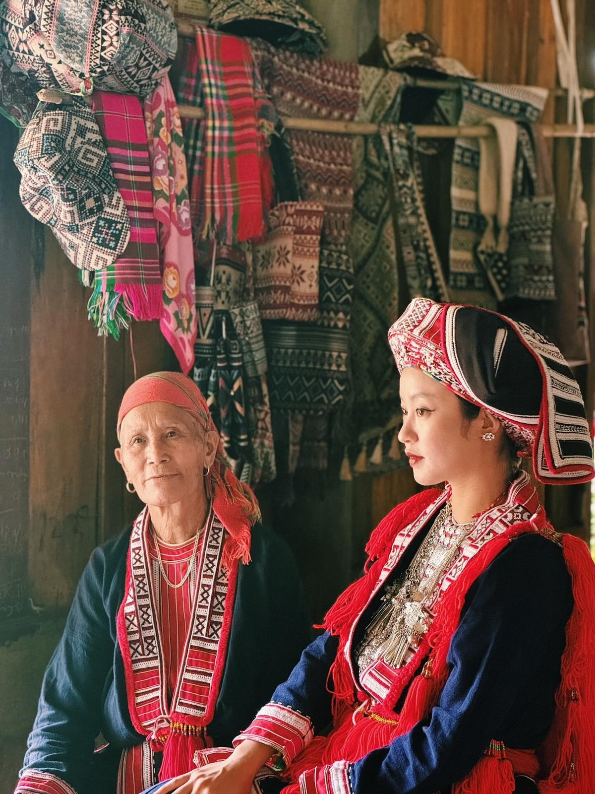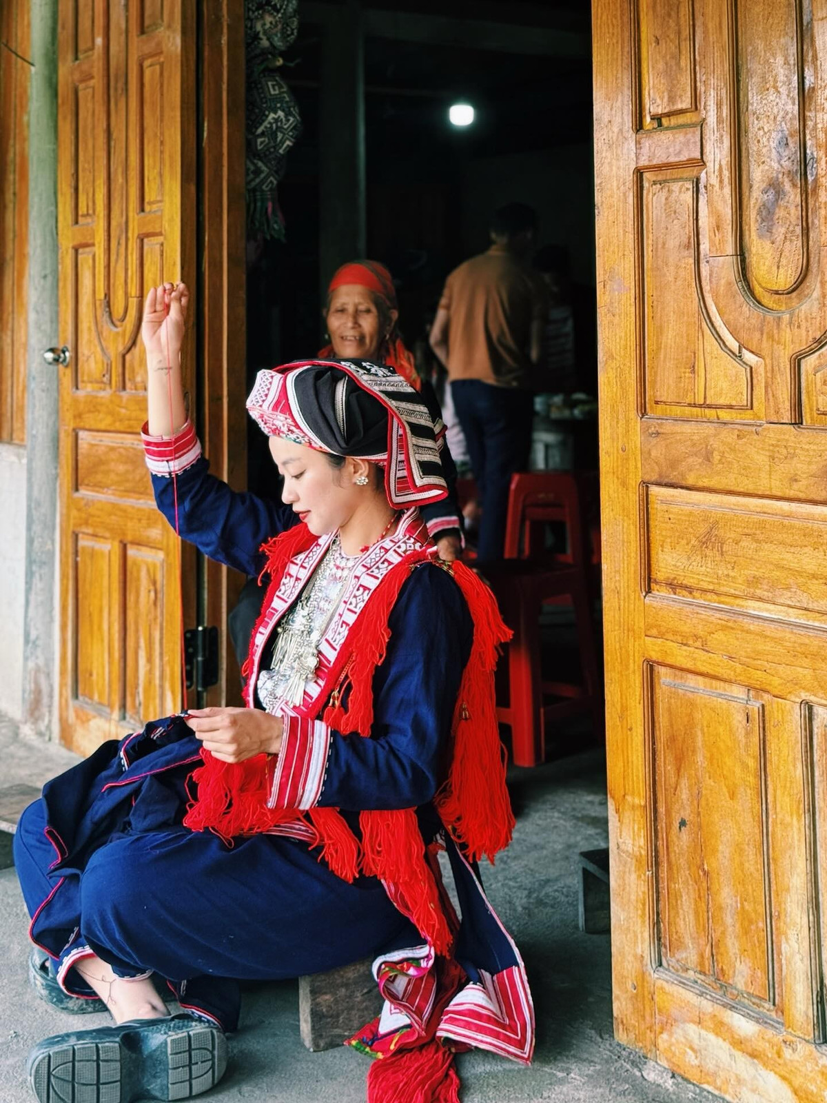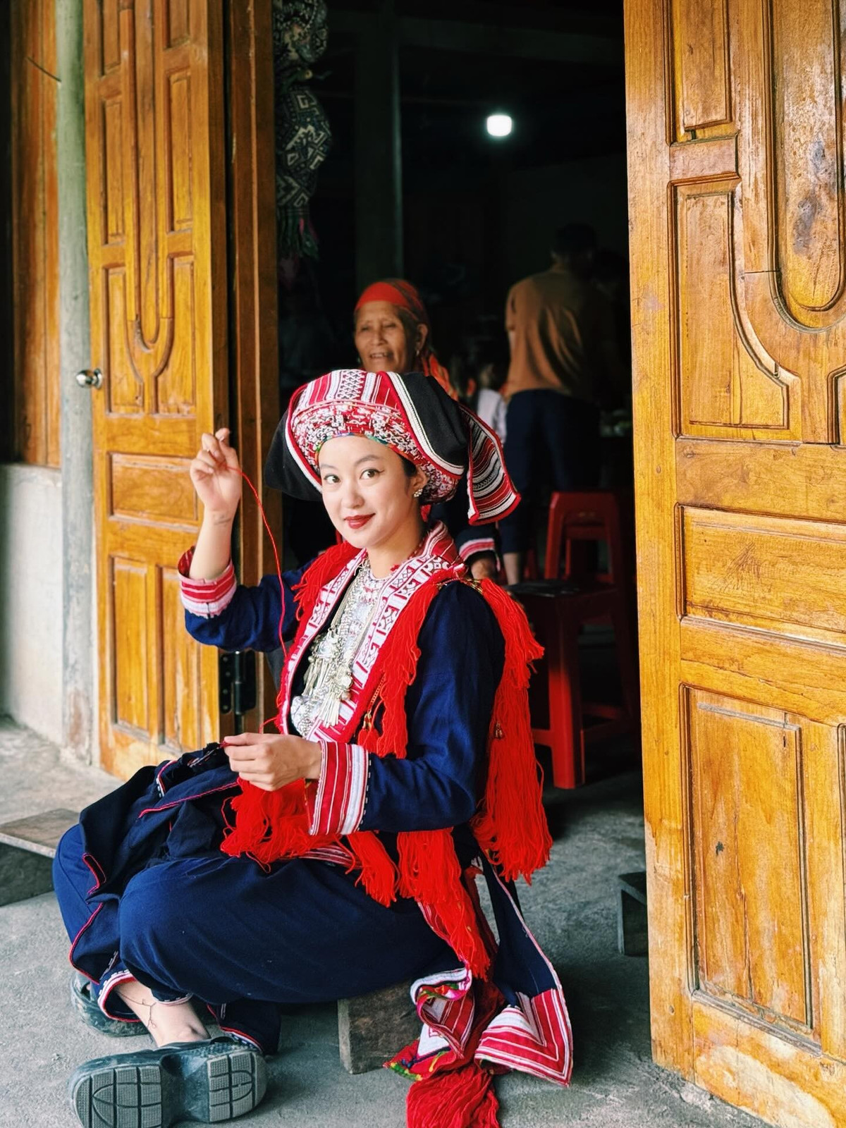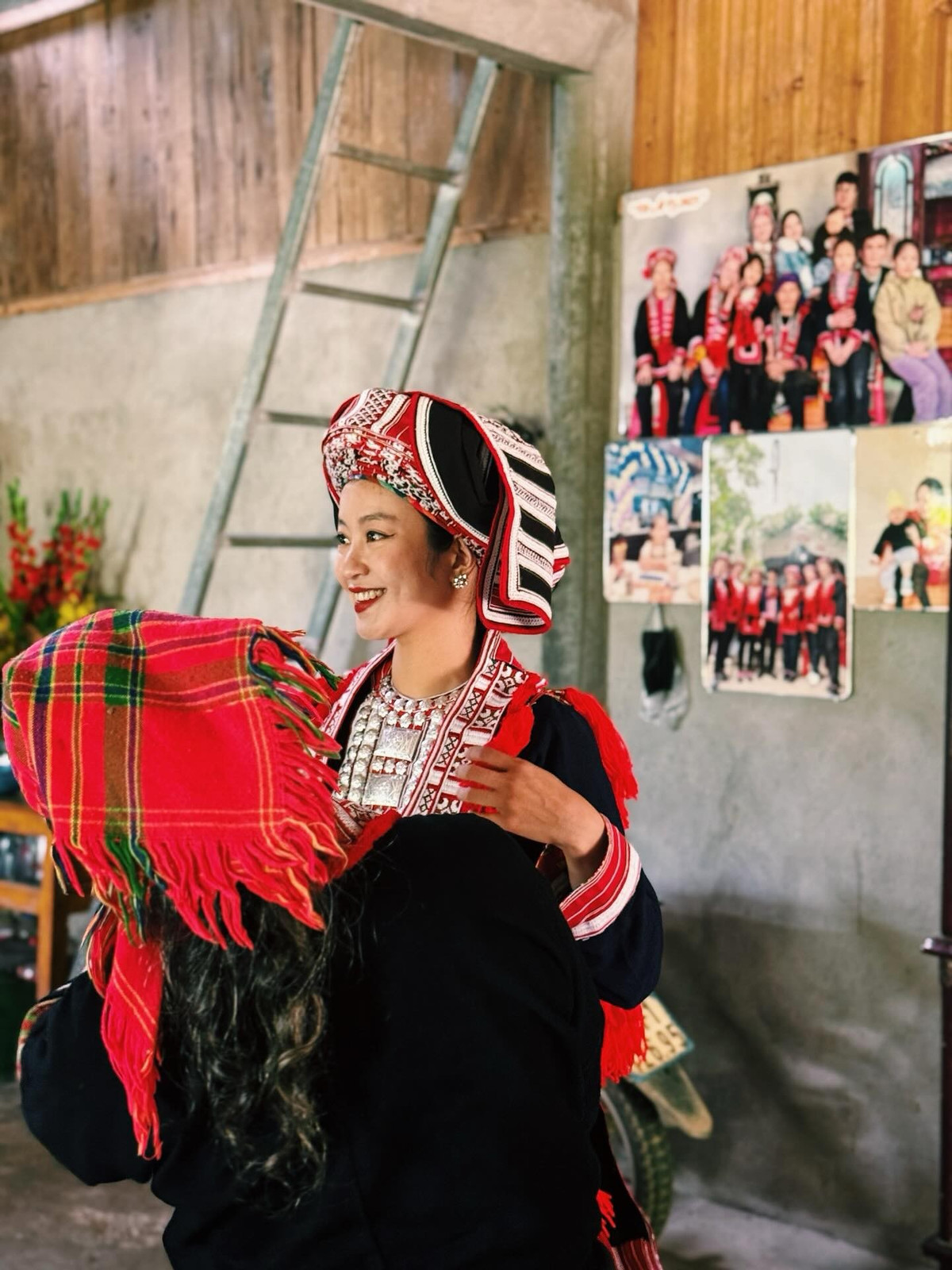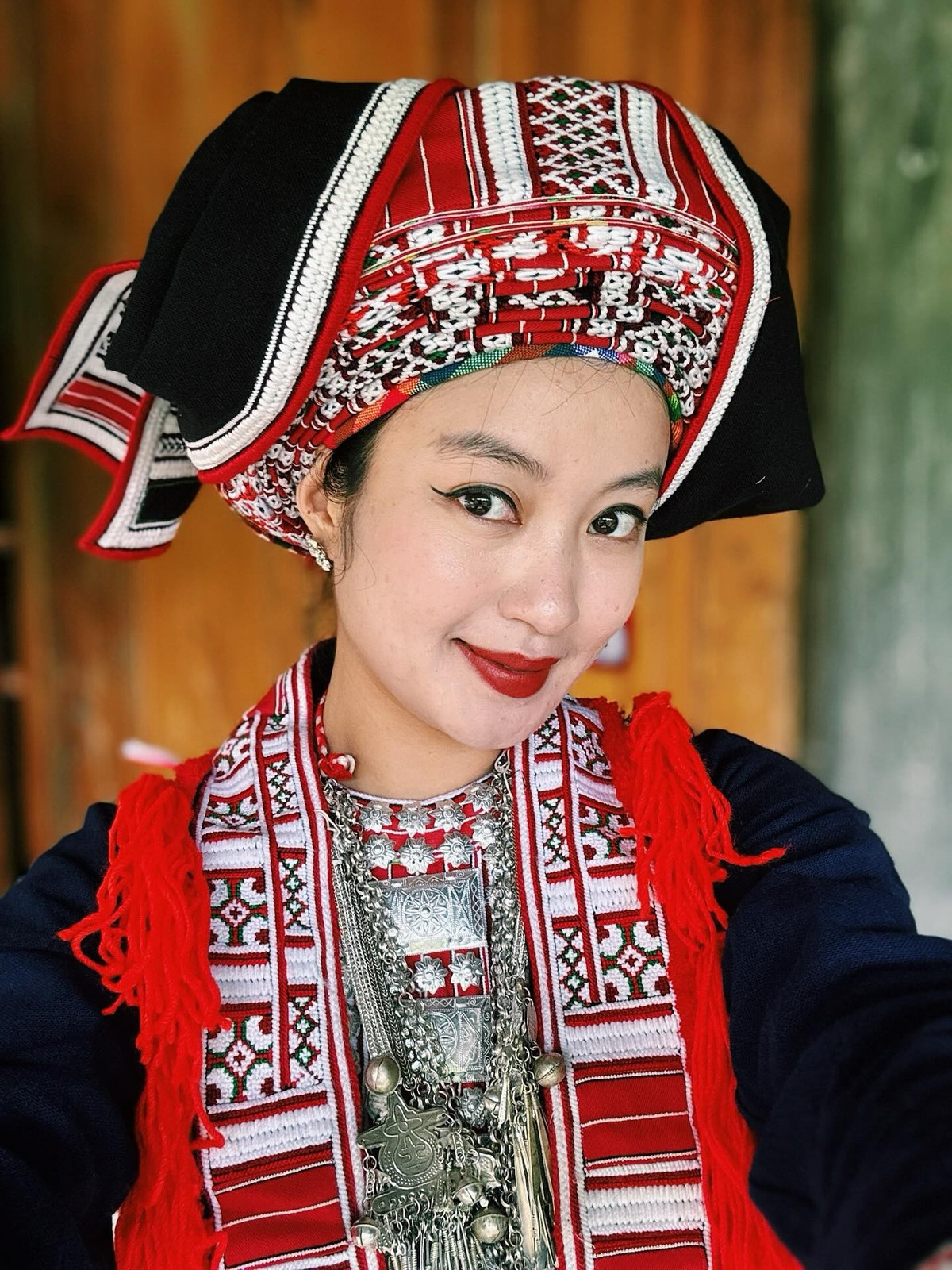 Trong bộ trang phục đặc trưng của phụ nữ Dao Đỏ với màu đỏ rực rỡ làm chủ đạo trên nền vải chàm, Mi Vân trông vô cùng duyên dáng và nổi bật.