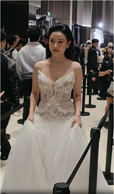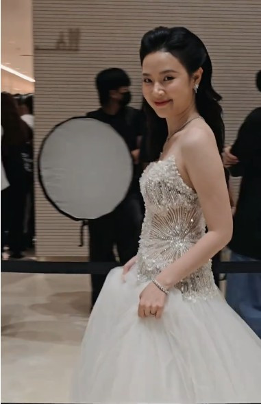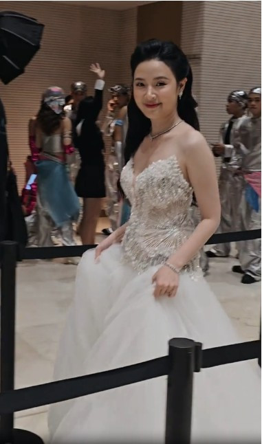 Ở khoảnh khắc quay lén, vợ thiếu gia Minh Đạt vẫn vô cùng xinh đẹp, làn da tươi tắn, nụ cười rạng rỡ. Cô liên tục vẫy tay chào mọi người khi biết có ống kính máy quay đang hướng về phía mình.