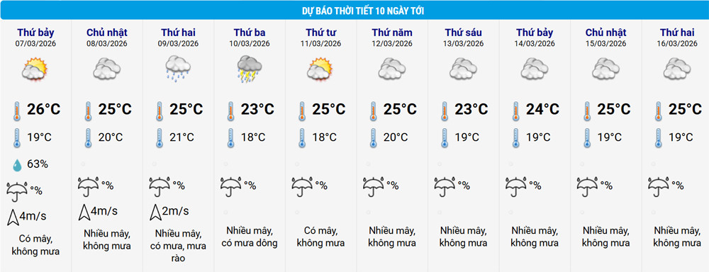 Ngày 8/3, Hà Nội nhiều mây, đêm và sáng có mưa nhỏ rải rác, gió đông nam cấp 2; trời lạnh, nhiệt độ thấp nhất 19-21 độ; trưa và chiều ít mưa, nhiệt độ tăng, mức cao nhất 24-26 độ.
