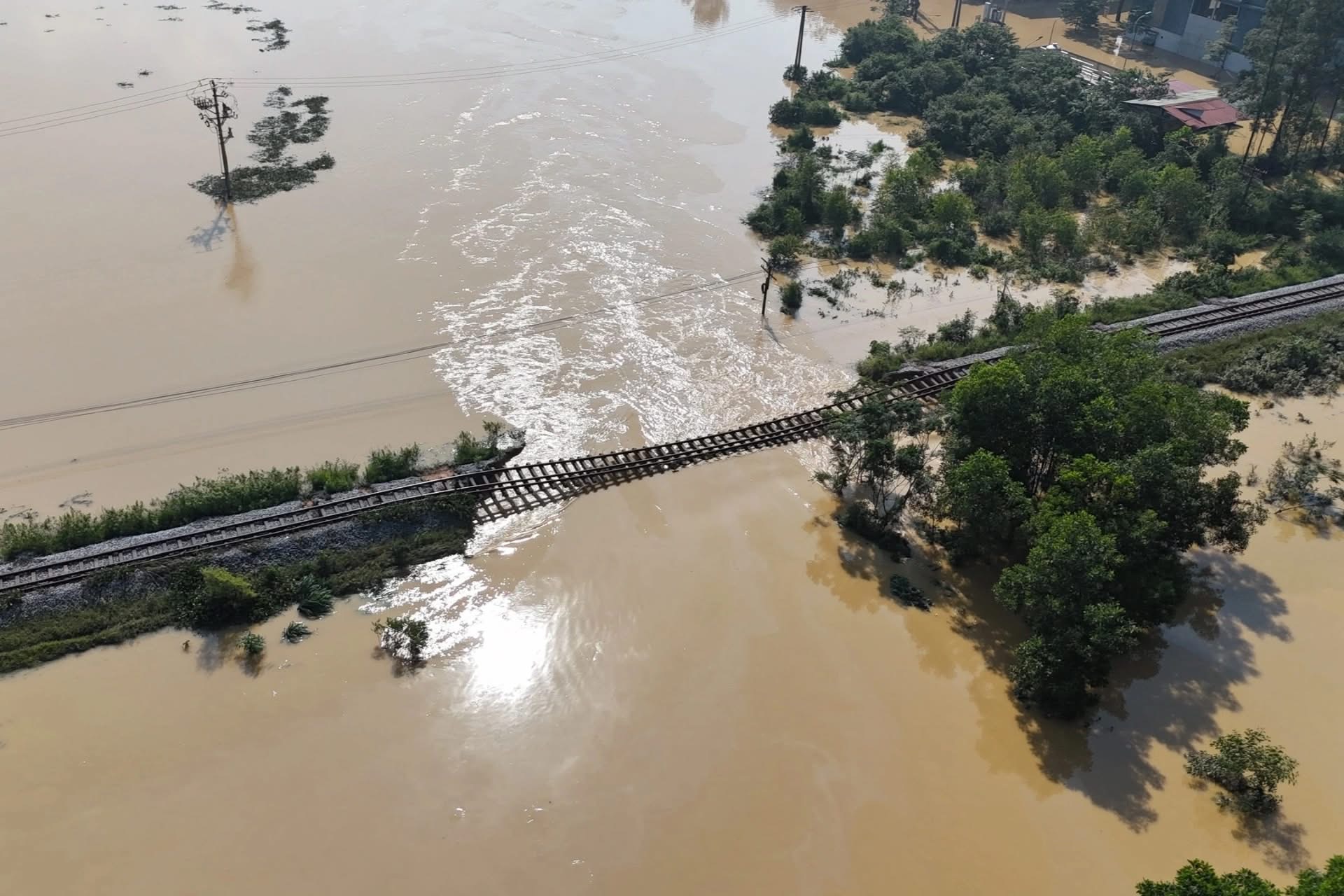 Nước lũ làm thủng nền tuyến đường sắt Hà Nội - Thái Nguyên qua xã Trung Giã (Hà Nội)