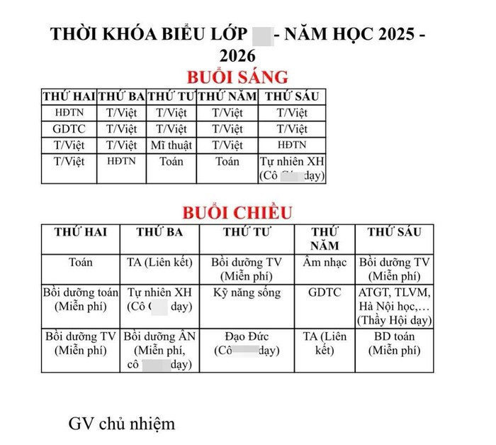 Thời khóa biểu của một lớp học tại Trường Trường Tiểu học Thái Hòa (xã Vật Lại, Hà Nội) có ghi các môn học liên kết.