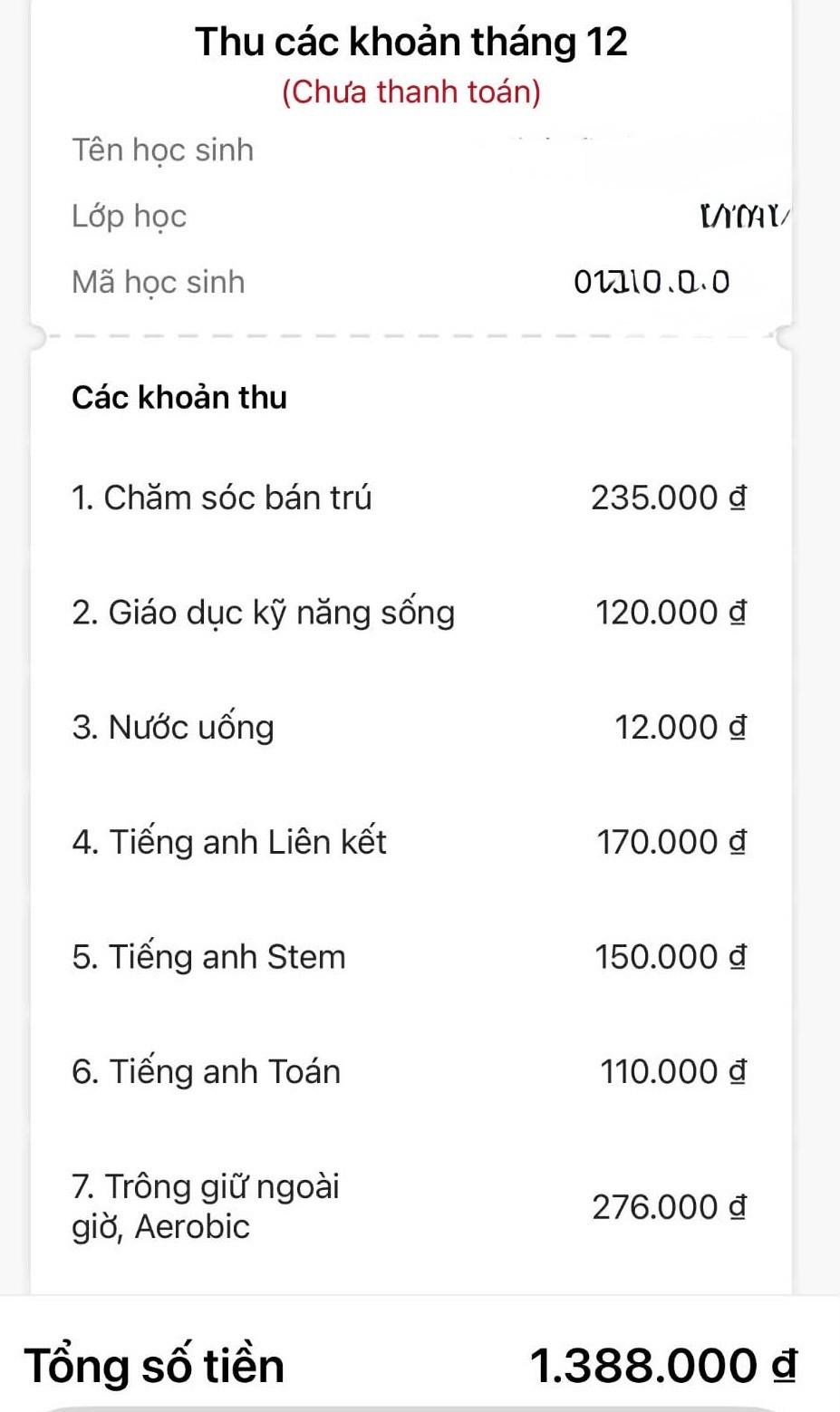 Với các khoản thu hằng tháng, theo chị Thanh, ngoài chương trình học chính khóa, trường này “đẻ” ra rất nhiều chương trình liên kết để thu tiền. Mới nhất là tháng 12/2025, chị phải đóng cho con lên tới 1.338.000 đồng bao gồm: chăm sóc bán trú 235.000 đồng; giáo dục kỹ năng sống 120.000 đồng, nước uống 12.000, tiếng Anh liên kết 170.000 đồng, tiếng Anh STEM 150.000 đồng, tiếng Anh Toán 110.000 đồng, trông giữ ngoài giờ, Aerobic 276.000 đồng và 345.000 đồng tiền ăn bán trú (sau khi đã trừ tiền hỗ trợ 20.000 đồng/bữa).
