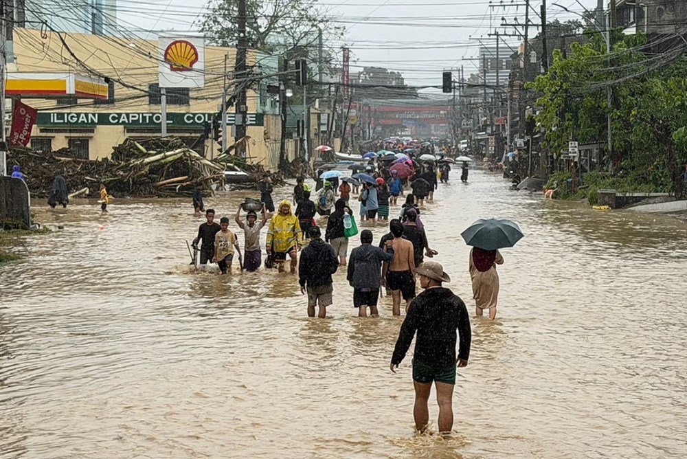 Người dân lội qua vùng nước lũ do bão Penha gây ra ở Iligan, Lanao del Norte, Philippines