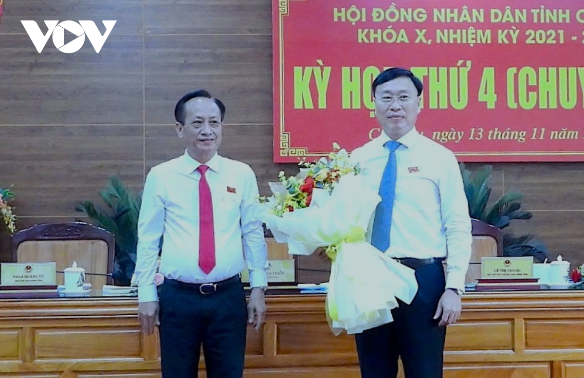 Ông Phạm Văn Thiều, Chủ tịch HĐND tỉnh Cà Mau tặng hoa chúc mừng ông Trí nhận nhiệm vụ khác