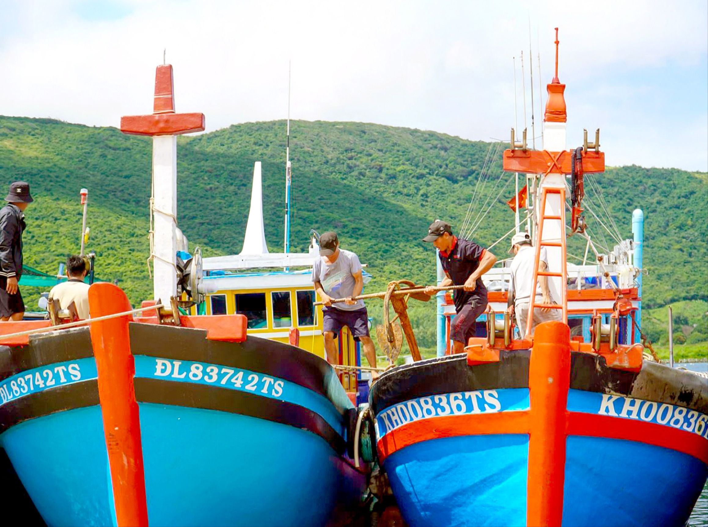 Ngư dân xã Đại Lãnh (tỉnh Khánh Hòa) chằng buộc tàu thuyền ứng phó cơn bão số 15. Ảnh: TIẾN THẮNG