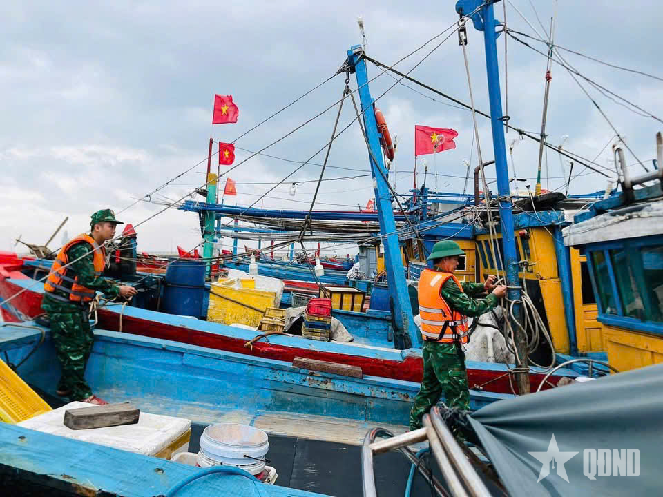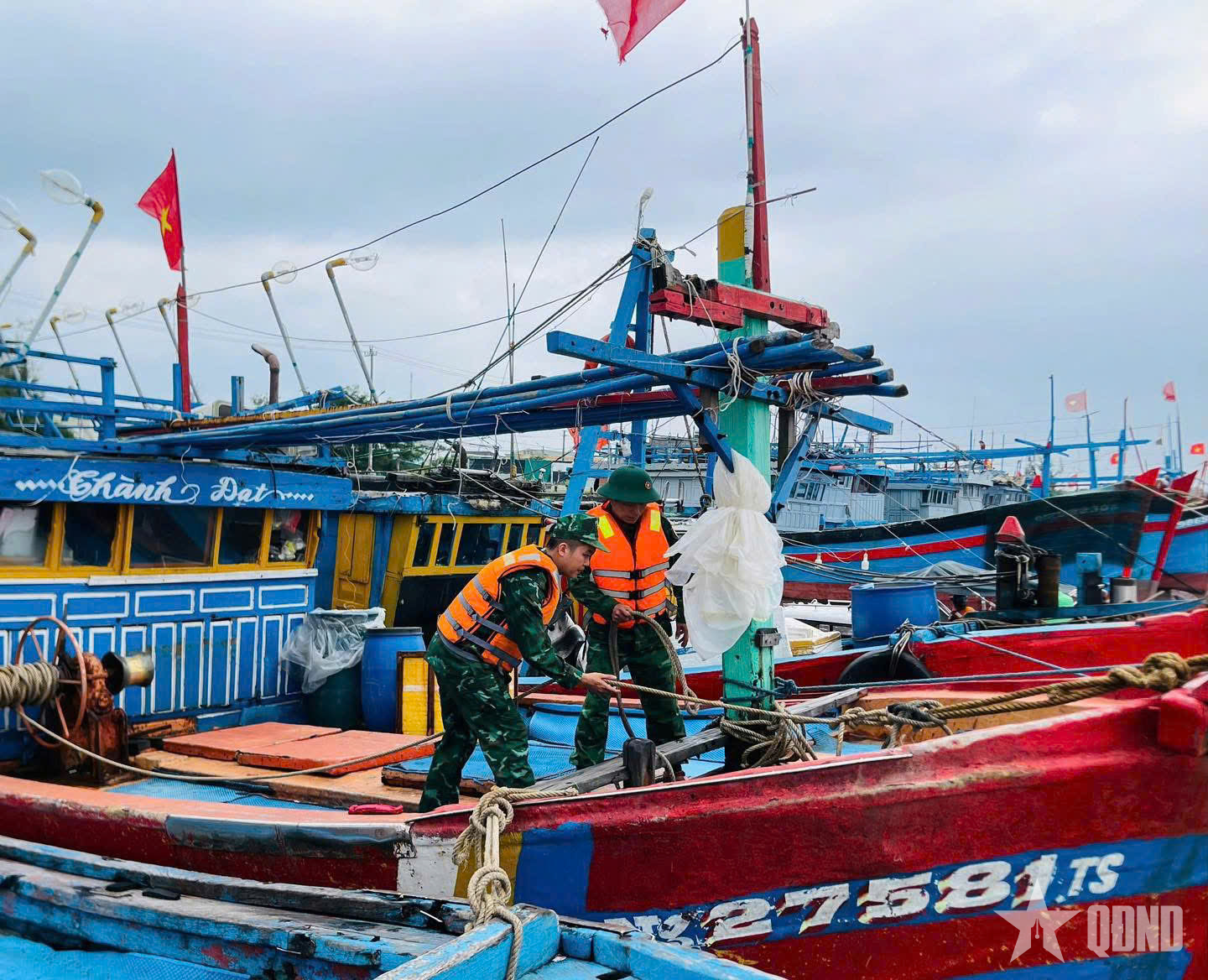Lực lượng Biên phòng tỉnh Quảng Ngãi giúp ngư dân neo đậu tàu thuyền trước khi bão đổ bộ.