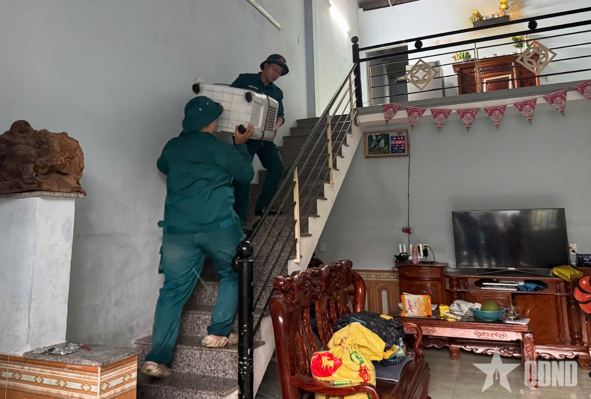 Lực lượng dân quân hỗ trợ người dân vùng “rốn lũ” Mẹ Suốt (phường Hòa Khánh) di chuyển đồ đạc lên cao.