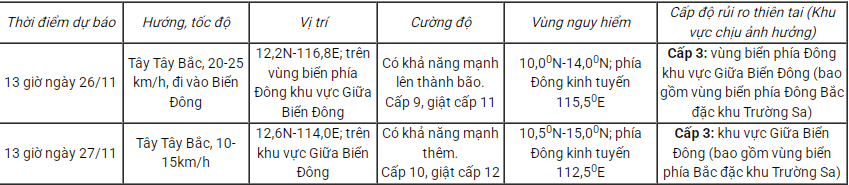 Cảnh báo đỉnh điểm (chiều 26 - 28.11): Khu vực giữa Biển Đông (bao gồm vùng biển phía bắc đặc khu Trường Sa) có khả năng chịu tác động của gió bão rất mạnh, có thể đạt cấp 10-11, giật tới cấp 14. Sóng biển cao từ 7 - 9 mét.
