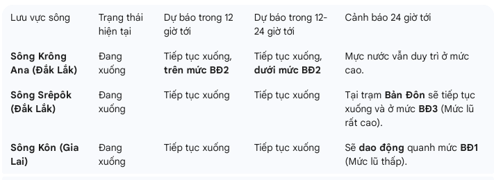 Hiện tại, mực nước trên các sông lớn tại Tây Nguyên, bao gồm sông Kôn (Gia Lai), sông Krông Ana, và sông Srêpôk (Đắk Lắk) đang có xu hướng giảm. Tuy nhiên, tình trạng ngập lụt vẫn tiếp diễn ở nhiều vùng và nguy cơ sạt lở đất vẫn ở mức cao.