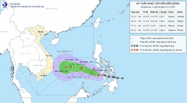 Các hiện tượng thời tiết nguy hiểm nhất từ ATNĐ/bão là gió mạnh, sóng lớn và biển động dữ dội. Từ chiều tối ngày 25.11, vùng biển phía đông khu vực giữa Biển Đông sẽ có gió mạnh dần lên cấp 6-7.