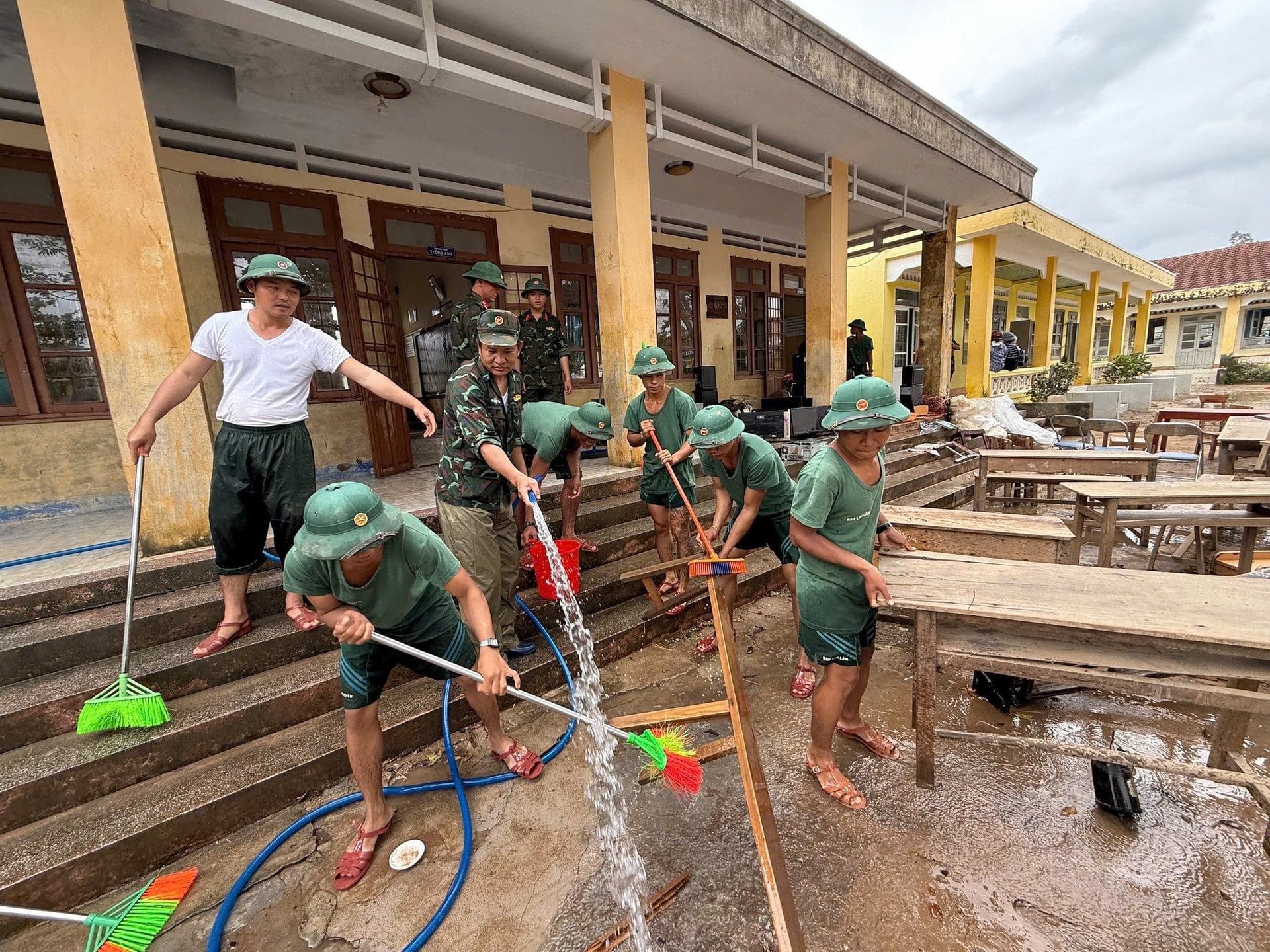 Cán bộ, chiến sĩ Lữ đoàn 573 giúp nhân dân xã Đông Hòa (tỉnh Đắk Lắk) vệ sinh môi trường, khắc phục hậu quả lũ lụt. Ảnh: X573