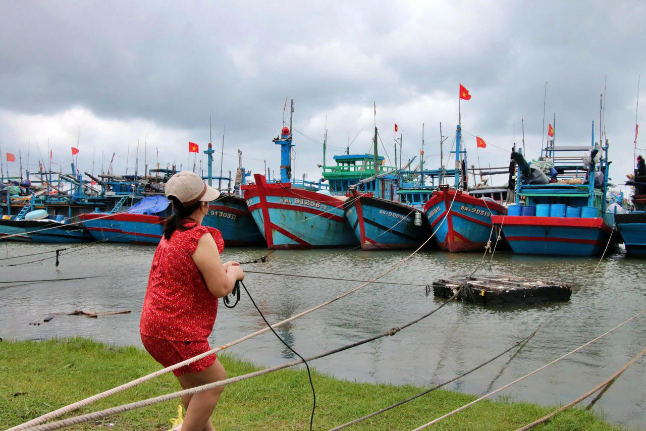 Người dân chằng dây tàu thuyền ở cảng cá Thọ Quang, TP Đà Nẵng.