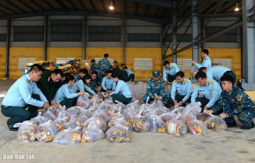 Trung đoàn Không quân 930 tiếp nhận 1.000 suất quà của Quân khu 5, tổ chức đóng gói để vận chuyển đến nhân dân các tỉnh Nam Trung Bộ. Ảnh: Văn Chung