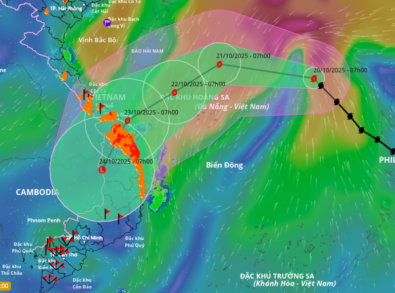 Sáng 23/10, tâm bão trên vùng ven biển từ TP Huế đến Quảng Ngãi. Bão có khả năng suy yếu, cấp 8, giật cấp 10, di chuyển theo hướng Tây Nam, với vận tốc khoảng 10 km/h.