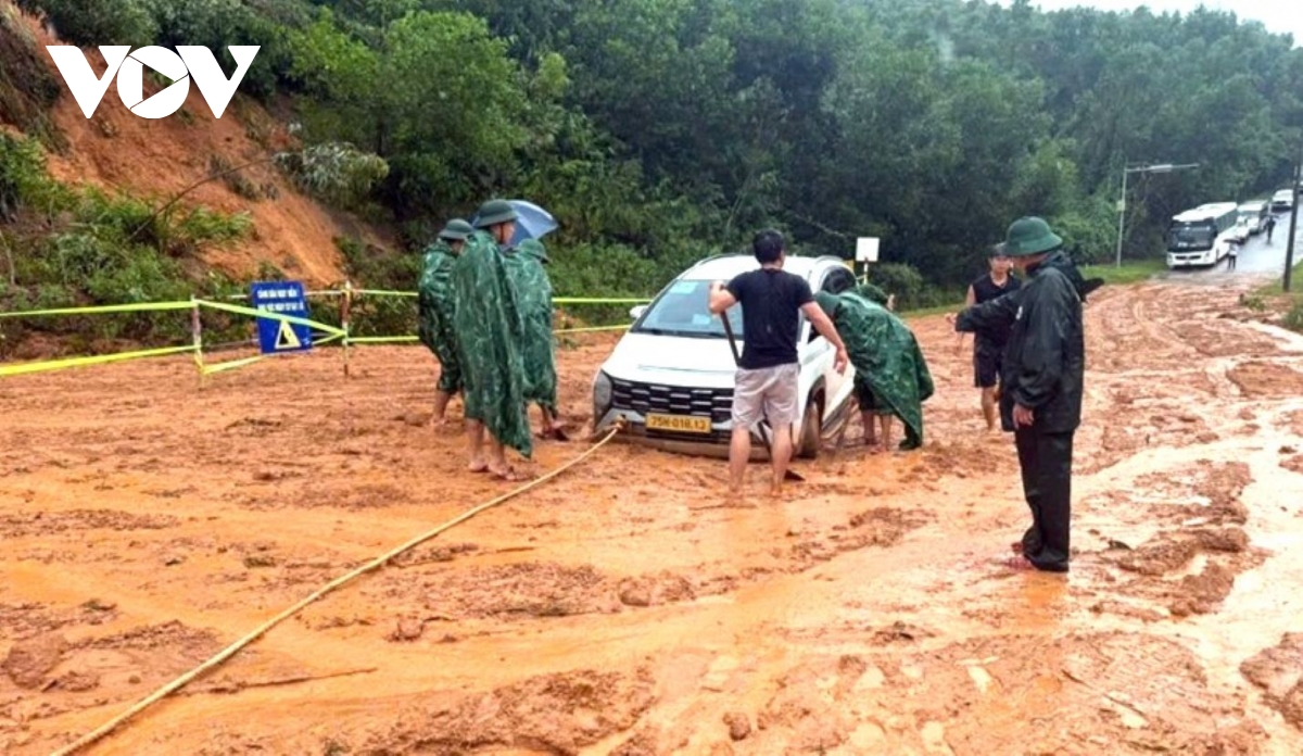 Đồn Biên phòng cửa khẩu cảng Chân Mây, thành phố Huế hỗ trợ đưa phương tiện ra khỏi khu vực sạt lở chiều 3-11