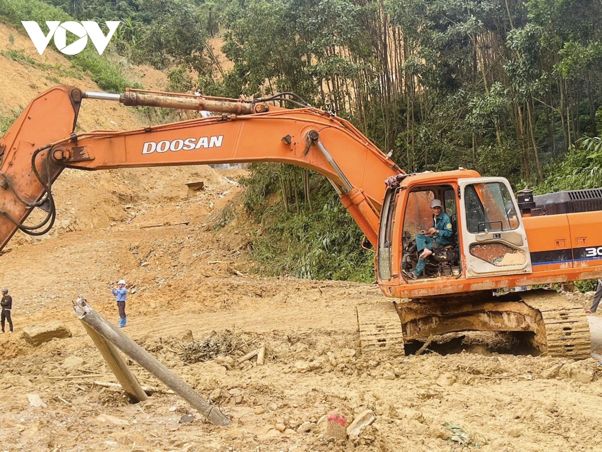 Huy động các phương tiện cơ giới khai thông các tuyến bị sạt lở