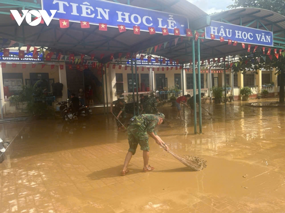 Hiện, các địa phương vùng rốn lũ tập trung dọn dẹp vệ sinh, sớm ổn định cuộc sống và đưa các hoạt động trở lại bình thường. Ông Nguyễn Xuân Tâm, Hiệu trưởng Trường Tiểu học số 2 Bình Minh, xã Bình Minh, tỉnh Quảng Ngãi cho biết, sau mưa lũ, nhà trường tập trung dọn dẹp vệ sinh, sớm đưa học sinh trở lại trường: “Các phòng học đều bị bùn phủ một lớp dày. Ngoài sân, đặc biệt là khu vực sân trường, bùn đọng rất dày nên phải nhờ lực lượng bộ đội và dân quân đến hỗ trợ dọn dẹp. Về hư hỏng thì có khoảng 50 mét vuông gạch bị nước cuốn trôi, tạo thành hố sâu. Ngay trước cổng trường cũng bị sạt, tạo một hố khá lớn".