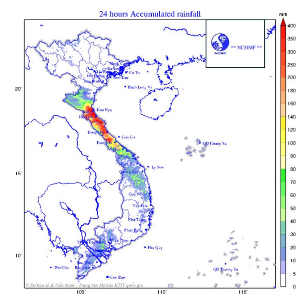 Từ đêm 31/10 đến hết đêm 01/11, khu vực từ Nam Quảng Trị đến Quảng Ngãi có mưa to với lượng mưa phổ biến từ 100-250mm, cục bộ có nơi mưa rất to trên 350mm.