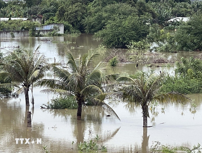 Nước Sông Lu dâng cao, gây ngập nặng nhiều diện tích hoa màu của người dân ở xã Phước Hậu, Khánh Hòa. (Ảnh: Công Thử/TTXVN)