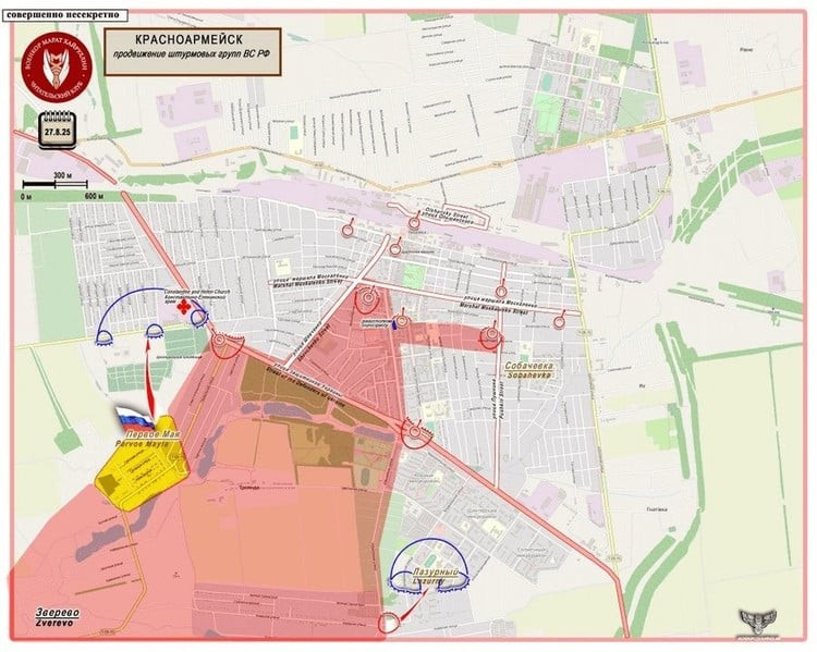 Hiện AFU vẫn còn kiểm soát tương đối một con đường nhỏ chạy từ phía bắc về phía đông qua làng Grishino rồi rẽ về hướng Pokrovsk. Vấn đề duy nhất đối với AFU là các đơn vị tiền phương của RFAF đã cách điểm cắt đứt thực tế của tuyến đường tiếp tế này chỉ từ 500-600 mét.