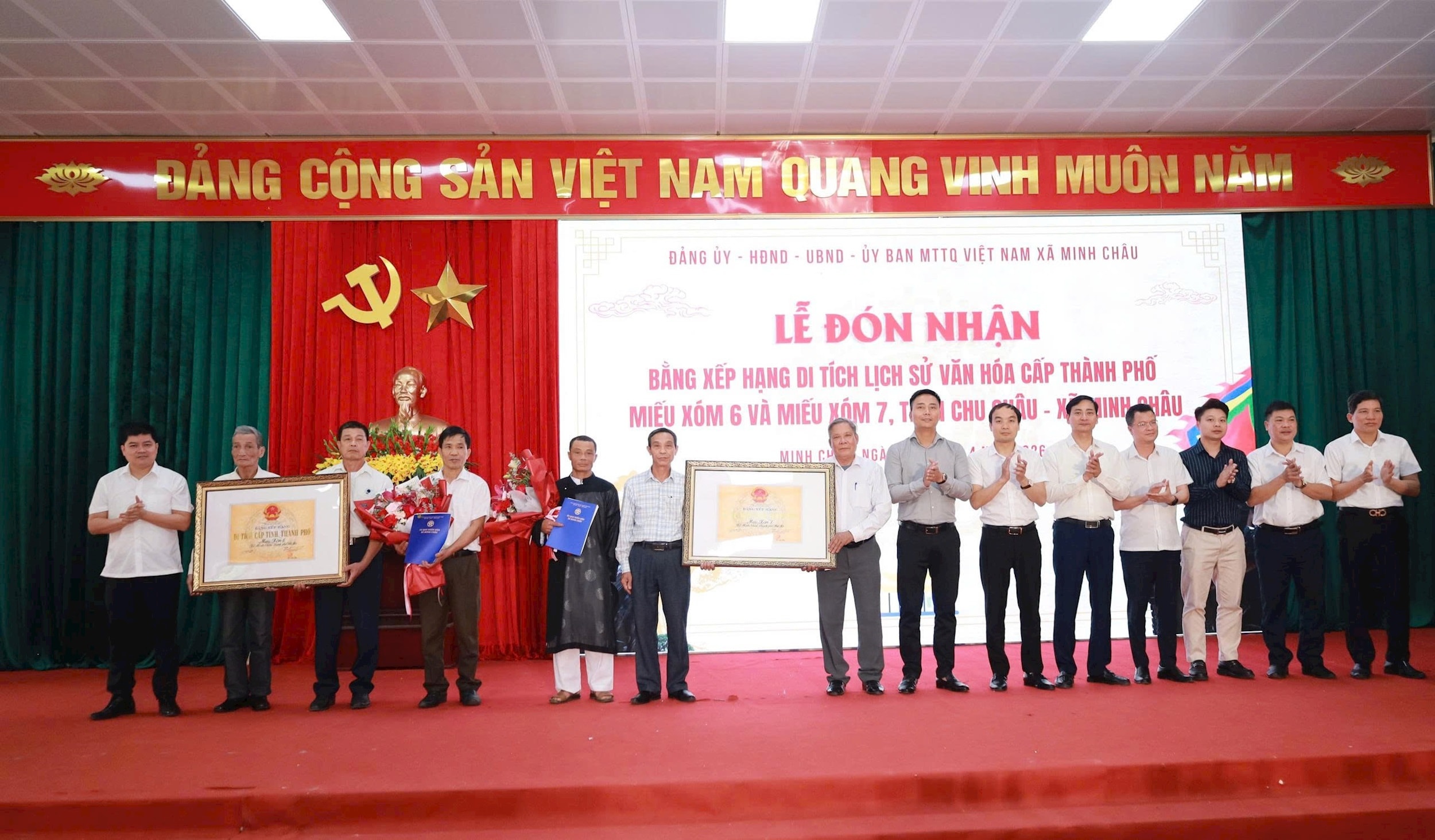 Các đồng chí lãnh đạo xã Minh Châu trao Bằng xếp hạng di tích và tặng hoa chúc mừng đại diện Tiểu ban quản lý di tích Miếu xóm 6 và Miếu xóm 7. Ảnh: PV.
