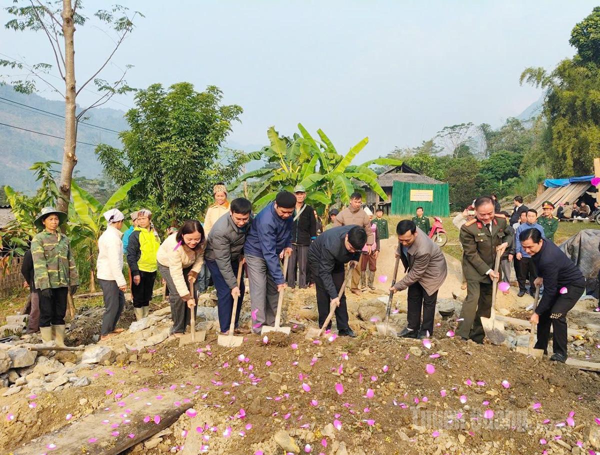 Các đại biểu thực hiện động thổ xây dựng nhà ở cho gia đình ông Triệu Xuân Tiến, thôn Bản Hình.