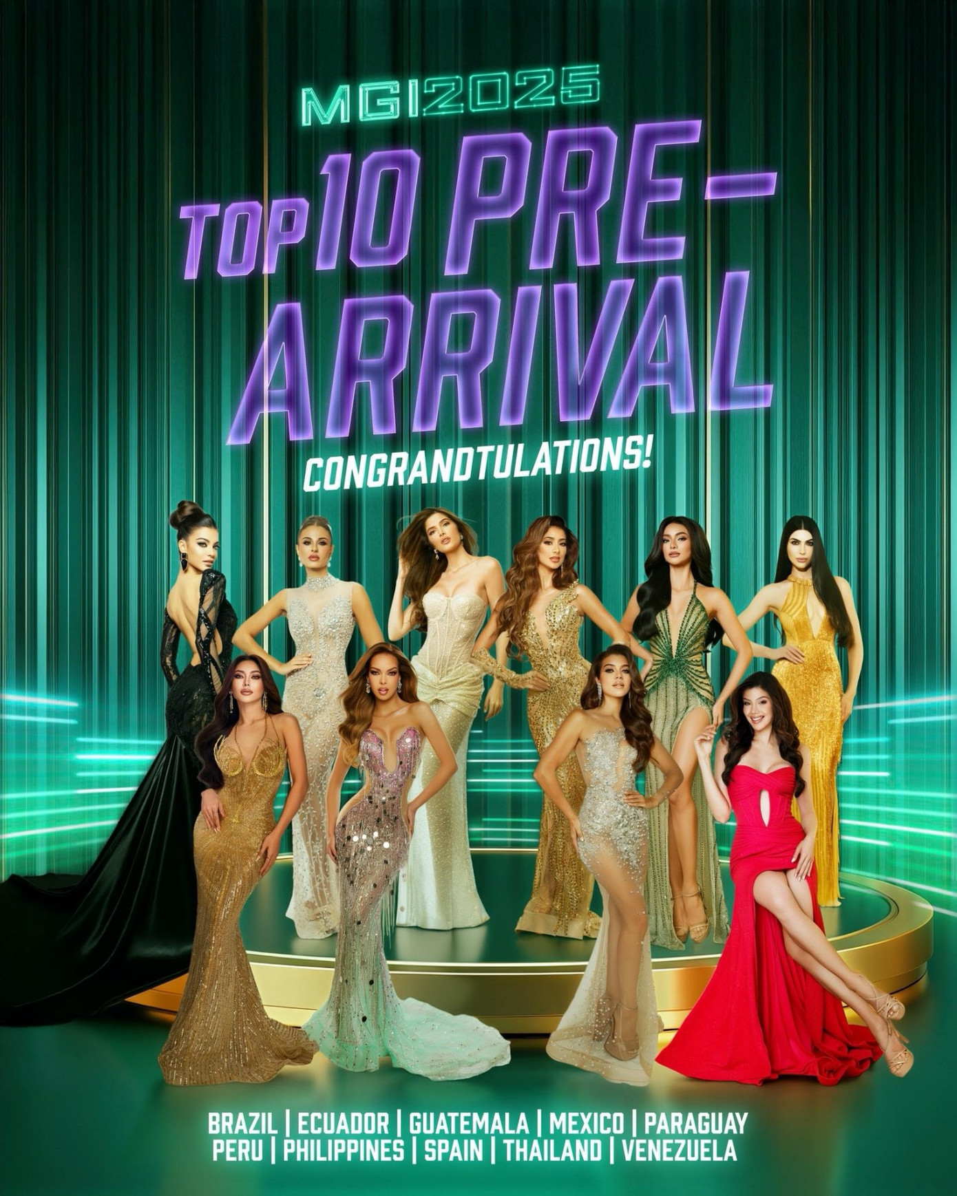 Trong Top 10 BXH Pre-Arrival của Miss Grand International 2025 được tham dự tiệc tối trước cuộc thi, chỉ có 2 đại diện Đông Nam Á là nước chủ nhà Thái Lan và Philippines, 1 người đẹp đến từ Tây Ban Nha, 7 người đẹp còn lại đều đến từ khu vực Mỹ Latinh gồm: Brazil, Ecuador, Guatemala, Mexico, Paraguay, Peru và Venezuela.