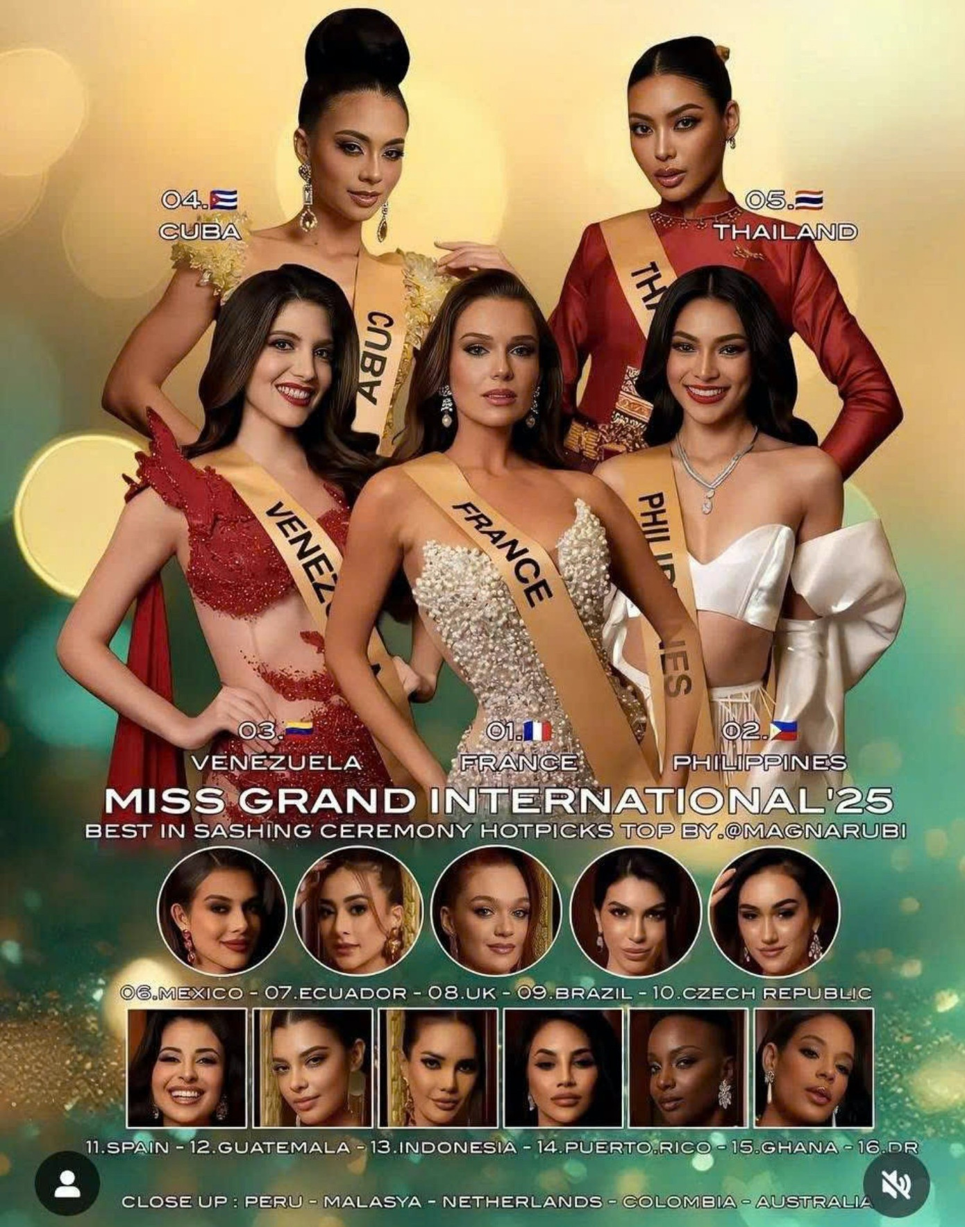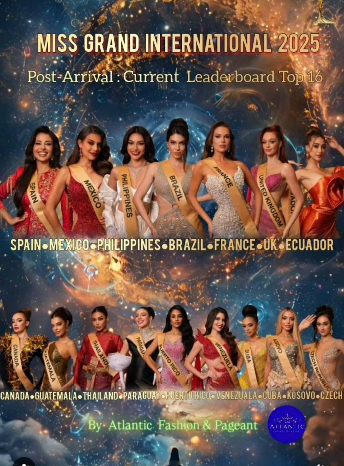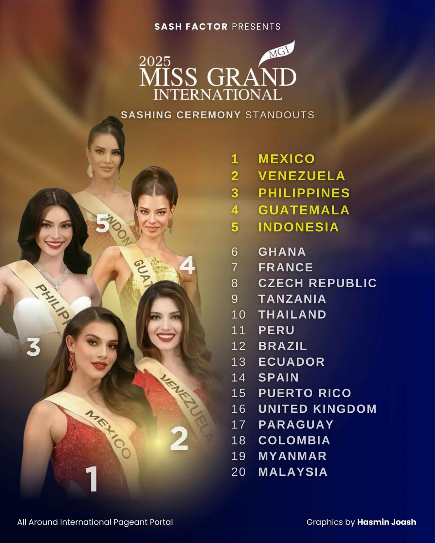 Năm nay, các đại diện đến từ Mỹ Latinh được đánh giá rất mạnh, dàn thí sinh của khu vực này sở hữu lượng fan hùng hậu, chiếm áp đảo trong giải thưởng bình chọn đầu tiên của Miss Grand International 2025 là Top 10 BXH Pre-Arrival. Trong Top 10 này, chỉ có 2 đại diện Đông Nam Á là nước chủ nhà Thái Lan và Philippines, 1 người đẹp đến từ Tây Ban Nha, 7 người đẹp còn lại đều đến từ khu vực Mỹ Latinh gồm: Brazil, Ecuador, Guatemala, Mexico, Paraguay, Peru và Venezuela.