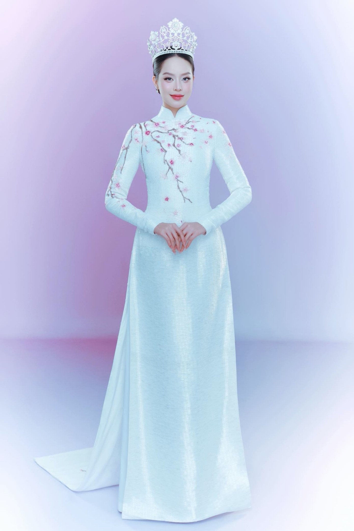 Trên sân khấu final walk, Hoa hậu Thanh Thủy bước đi những bước cuối cùng trong vai trò đương kim Miss International. Người đẹp khiến fan sắc đẹp vô cùng tự hào khi lựa chọn tà áo dài truyền thống cho khoảnh khắc ý nghĩa này. Trang phục với họa tiết hoa anh đào đính sequin, được NTK Lê Thanh Hòa chuẩn bị riêng cho Hoa hậu Thanh Thủy.