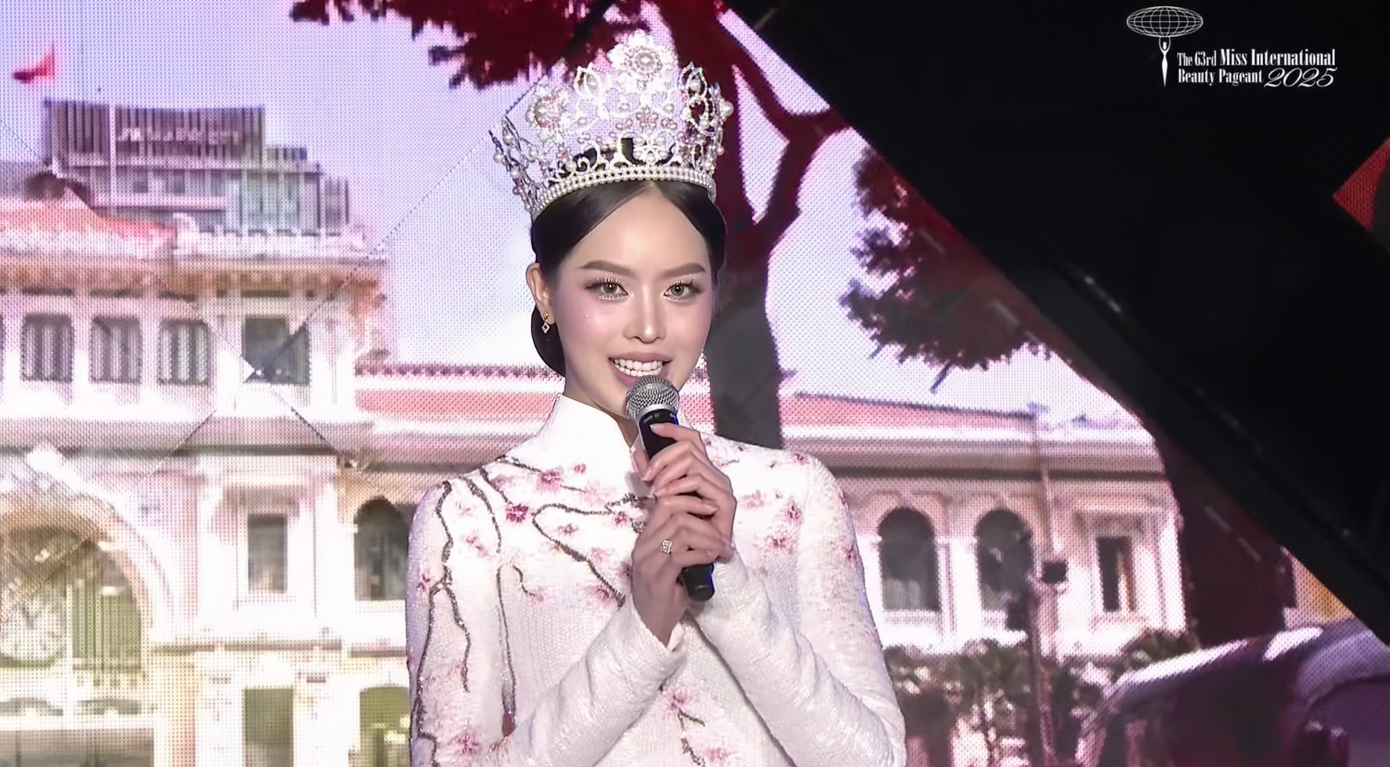 Trong bài phát biểu, Hoa hậu Thanh Thủy gửi lời cảm ơn sâu sắc đến Tổ chức Miss International, công ty quản lý cùng ekip đã đồng hành suốt một năm qua.